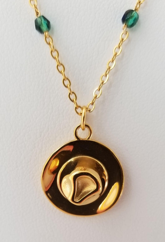 Blue Green Cowboy Hat Pendant Station Necklace in Stainless Steel Gold
