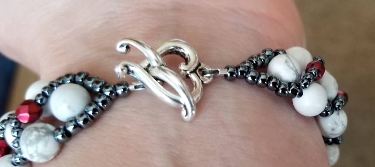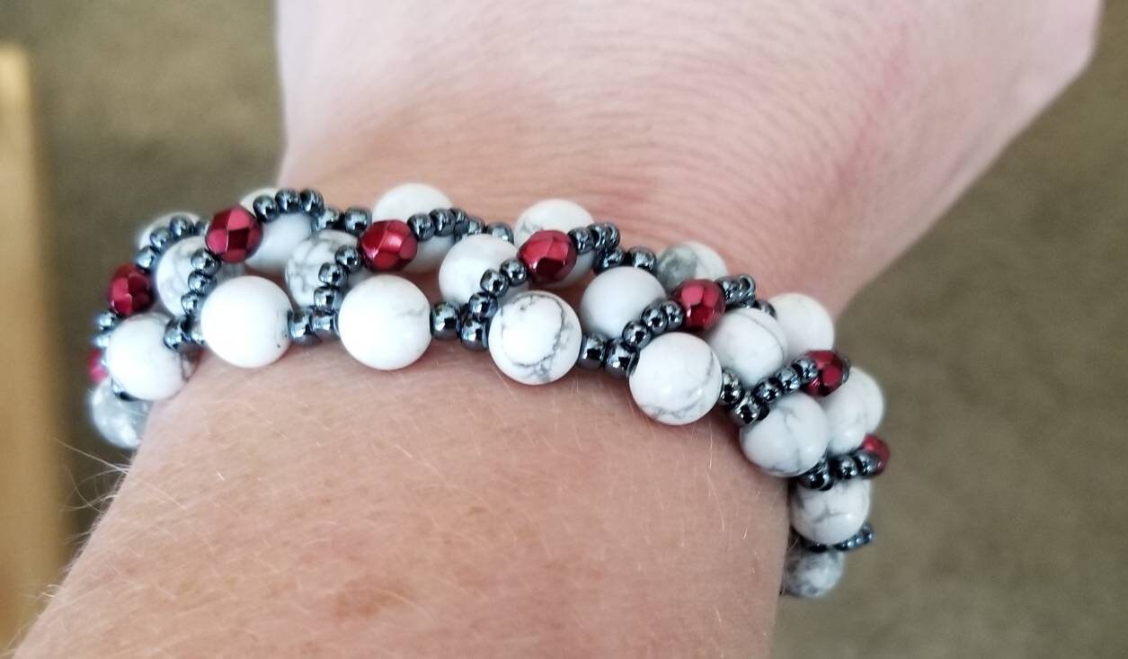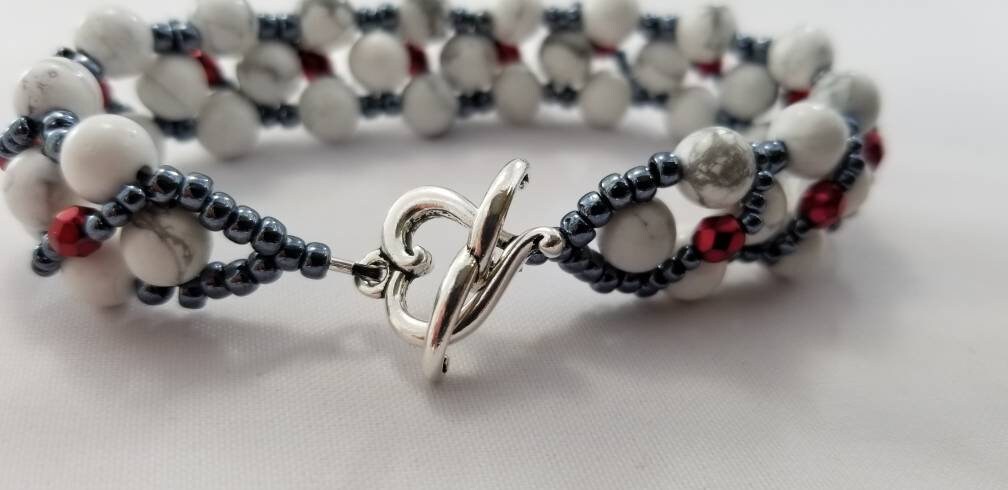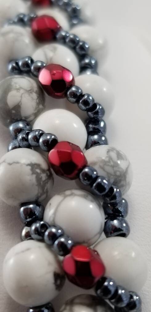 This stunning White Howlite Gemstone Bracelet showcases a beautiful blend of craftsmanship and style, expertly created using the right-angle weave stitch technique. The bracelet features 6 mm White Howlite gemstones, known for their calming properties, which are elegantly complemented by vibrant Red Carmen Firepolish beads and shimmering Metallic Hematite seed beads in both 11/0 and 8/0 sizes.